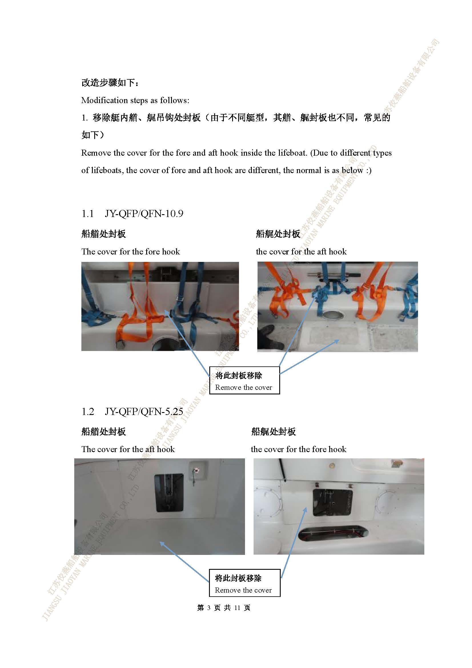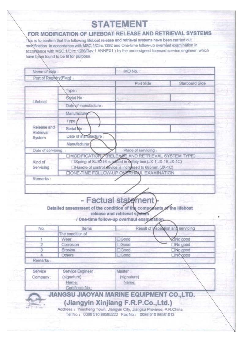 近期,发现国内存在一些服务公司为牟取私利,置船员生命安全于不顾,未经我公司专业培训和认可,擅自对我公司(三亿网页版/江阴新江玻璃钢有限公司)生产的救生艇设备进行救生艇吊钩改造,同时签发伪造的声明,因此引起了重大的安全事故.重要提示:三亿网页版(江阴新江玻璃钢有限公司)对一切未经本公司专业培训和认可的服务商提供的对本公司产品的所有服务不承担任何责任,并保留对其追究法律责任的权利.